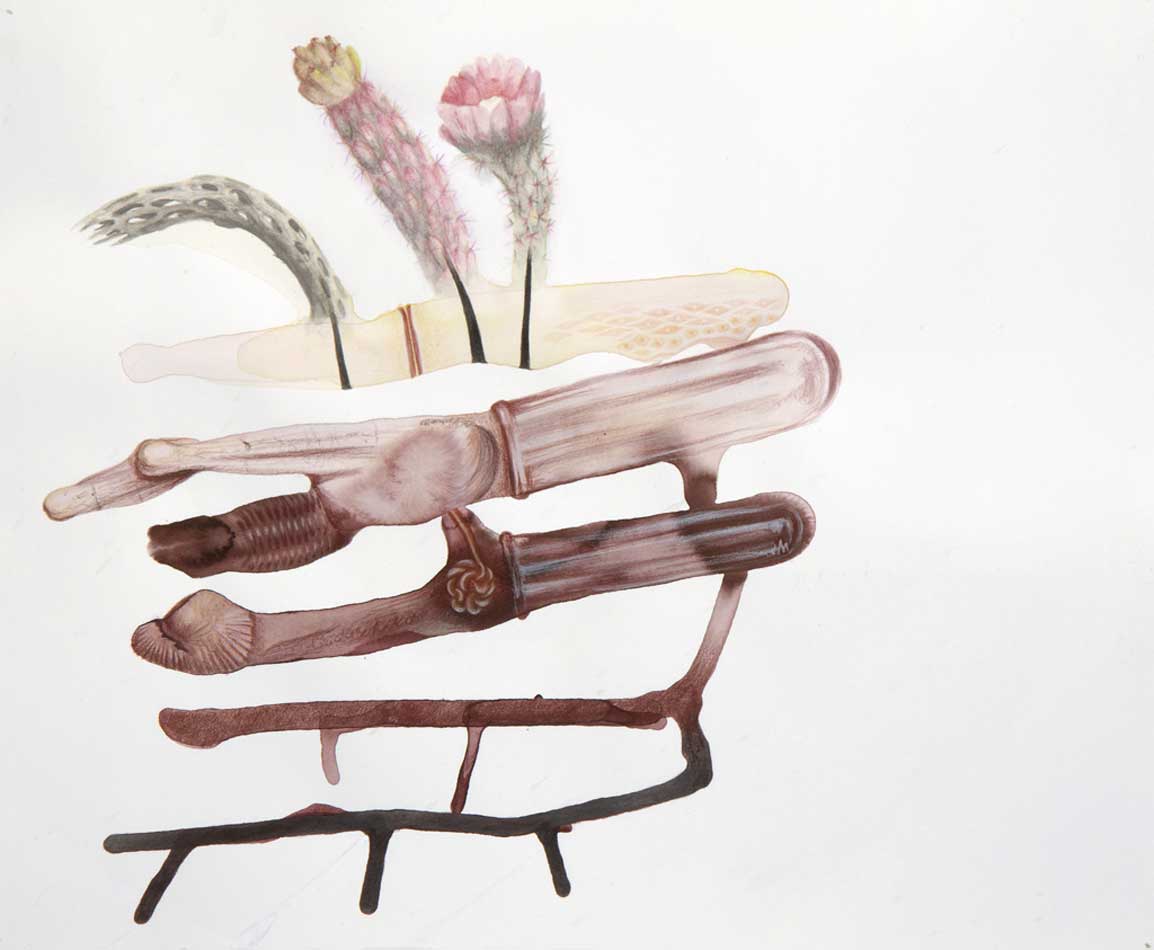 Pareidolia is the psychological phenomenon of seeing a recognizable image in something otherwise random, like clouds or wood grain. In the summer of 2011, I spent two months as an artist in residence at the Santa Fe Art Institute, which is located in the high desert of New Mexico at about 7,260 ft. above sea level. The reduced barometric pressure, low oxygen, dry air, strong sunlight, smoke plumes, and various other environmental factors immediately affected my body as I embarked on exploring the culture of the city and surrounding area. I began a series of Pareidolia drawings that reflected both my bodily and societal experiences in Santa Fe, merging them into an amalgam of symbolic and illustrative representations. The drawings always begin with spilled and blotted ink on paper, which lends itself to imagery that I draw directly on top of the dried ink.