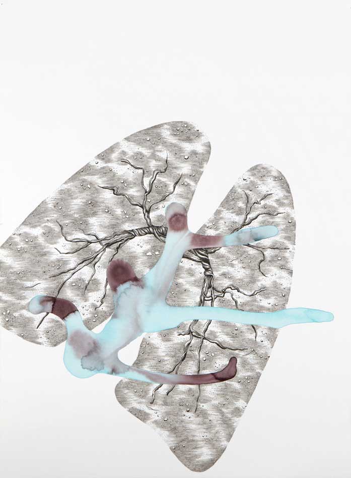 Ultimately this entire body of work alludes to the confusing mixture of curiosity, fear, awe, and mystery that surround the concepts of illness, research, and scientific progress. The drawings are at the same time enticing and repulsive; they are detailed and graceful, yet chaotic and unpredictable.