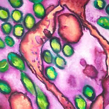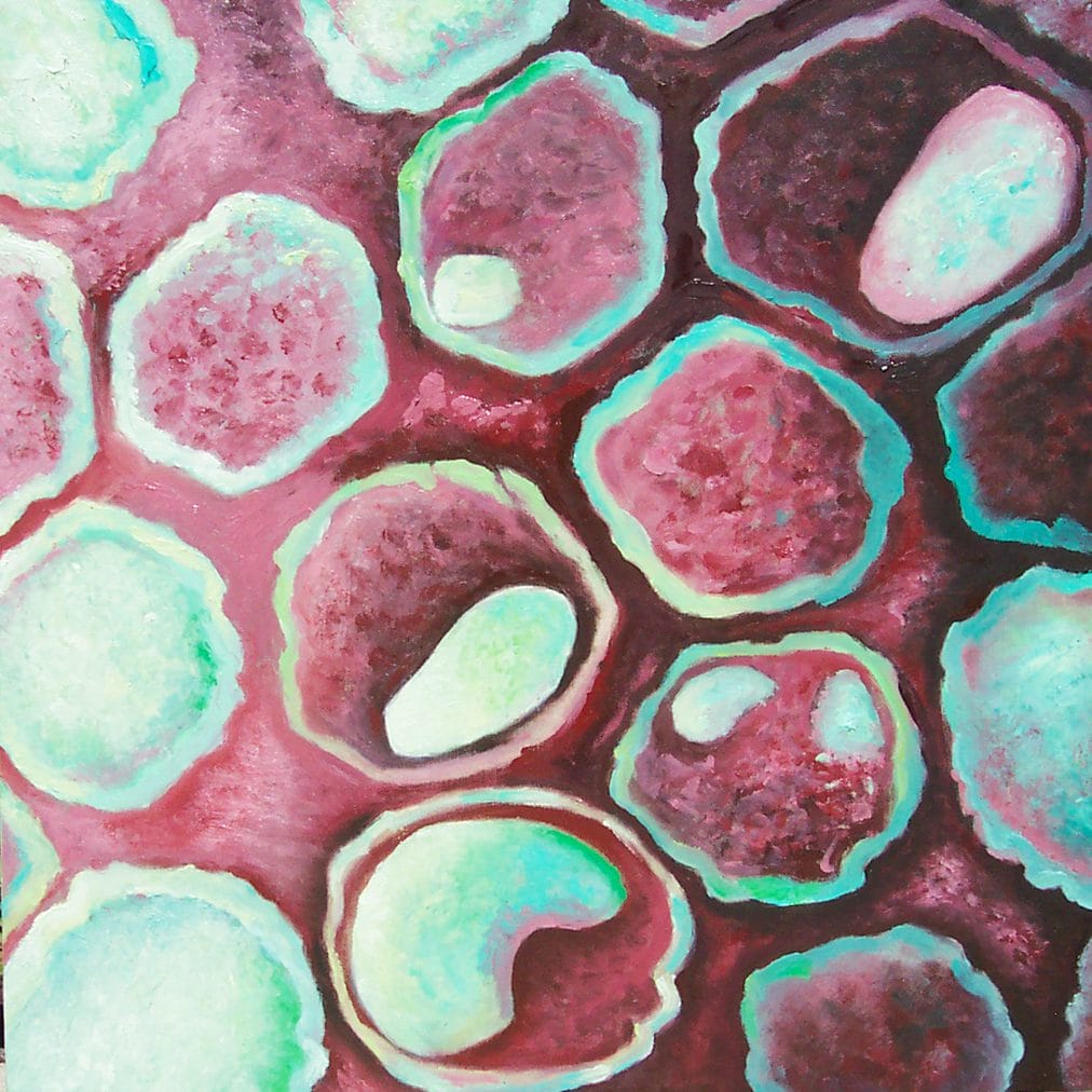 My paintings are based on electron micrographs of viruses and bacteria. Demystification and educated awareness are my primary goals in visualizing the microscopic. By visualizing the microscopic, I exercise control over the seemingly uncontrollable, separating phobia from aesthetic experience. With these paintings I hope to explore the interaction between Beauty and Fear.