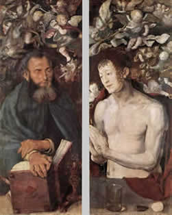 It is noteworthy that a similar pair of hands in prayer can be seen in Dürer’s Dresden Altarpiece, now on display in the Gemäldegalerie in Dresden, Germany (Fig. 4). The central panel of this triptych was completed around 1497, and the two side panels, which concern us here, were added about 1504.8 The left panel depicts St. Anthony with hands that are severely deformed, but not held together in prayer. Dürer himself suffered from a familial arthritic condition which involved the joints in his hands, and he was keenly aware of such deformities.9 Opposite, on the right panel, St. Sebastian is shown praying with his hands in the same position as those in the Praying Hands preparatory drawing.
