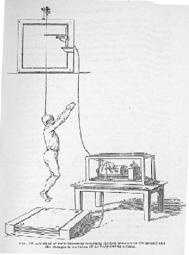 For example, the global chronophotographic and kinematic description of a vertical jump gives information about the parabolic trajectory of the center of gravity. This trajectory makes it possible to calculate the work generated, but above all to estimate the muscular force of the lower limbs. The recording of the force exerted on the ground, with the development of pneumatic capsules and later the creation of a force platform, dictated to Marey that every muscular act that results in raising the body’s center of gravity increases the pressure exerted on the ground.