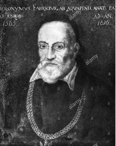 The Bursa of Fabricius is a sac-like organ responsible for producing immunogenic B-lymphocytes and present only in the cloaca of birds. But the man who described it, far from being an obscure ornithologist, was a reputed professor of anatomy and surgery. Born in 1537 near Orvieto in central Italy, he had as a youngster a sharp wit and an excellent memory, and was sent to Padua, where he learned Greek, Latin, logic, and philosophy before studying medicine. He remained at the University of Padua after graduating and became assistant in anatomy to Gabriele Fallopio, demonstrating great aptitude in teaching and dissections. Padua at that time was a Venetian possession, part of the terra firma, and its prestigious anatomy department at the University, perhaps the best in Europe, had been the site of great advances under Andreas Vesalius, Realdo Colombo, and now Gabriele Fallopio. On the death of the latter in 1562, the Senate of Venice recognizing his talents appointed Fabricius professor of anatomy and surgery even though he was only twenty-five years old.