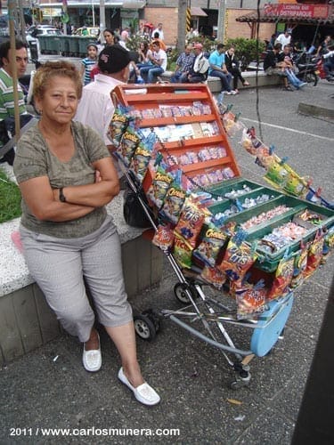 In Colombia, as in other third-world countries, it is common to see street vendors of many types of goods. On Sundays and holidays, they concentrate around cinemas, sports arenas, the bullfighting ring, and other places where people tend to congregate. The most frequent articles for sale are food items, and the vendors may have small portable grills for foodstuffs that need to be heated. Fruits, large avocados or baked goods are sold in various corners of residential areas of the city, and people drive by in their cars to purchase what they want. Nowadays, with modernization, the busy streets are invaded by vendors who risk the intense traffic and approach vehicles during a red light stop to sell cards for cellular minutes, cellphone cases, chargers, and other gadgets.