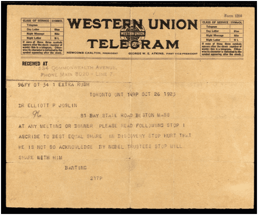 Figure 4. Telegram of Dr. Banting to Dr. Joslin acknowledging Best as Co-Nobel Laureate, October 26, 1923