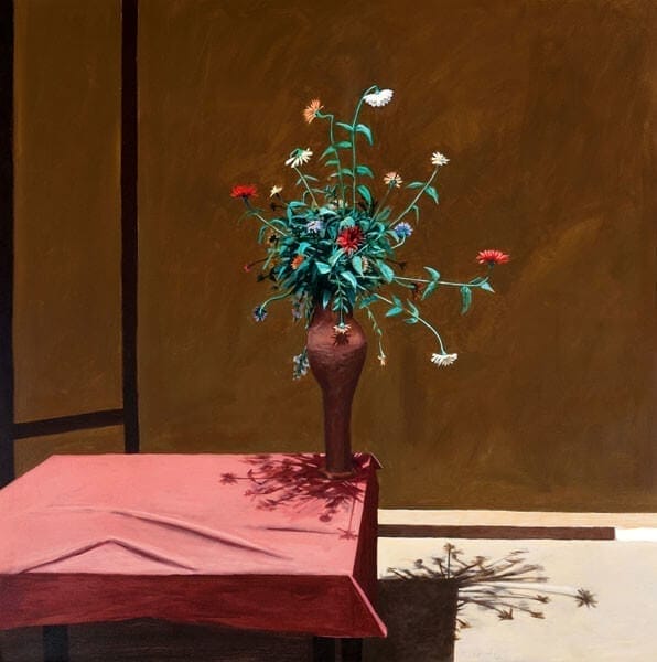 Jimmy Lueders’ Armand’s Pot II projects from the wall on which it hangs at the Woodmere Art Museum. A burgundy silhouette vase poised at the edge of a table casts a slim shadow of flowers on the tablecloth beneath it. Below the table, a firework of shadows from the flowers above bursts forth from a square of darkness onto a brightly lit blond-colored floor. Tiny long-stemmed wildflowers in various stages of life are entangled in one another; a mess of green leaves, a red or white flower escapes from the tangle as if to catch its breath.