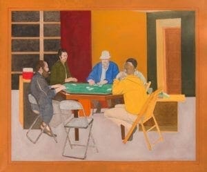 Lueders and Mednick met in 1962 at the studio of Philadelphia artist Larry Day. At Day’s studio, artists Mednick, Lueders, Dennis Leon, Massimo Pierucci, and David Pease met regularly to talk and critique their latest works of art. Eventually, bored by these discussions, the group of artists began playing cards. Conversations once limited to examining and critiquing paintings now included playing poker and talking about their lives. They became close friends and met on the first Sunday of every month for fifty years.