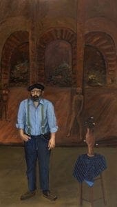 In front and to the side of Armand is painted a cloth-covered stool upon which a slender vase rests. The vase is one of Armand’s favorite pots. Mednick explained: “Lueders encompasses my whole life in that picture by having a huge version of one of my Holocaust tiles in the background and one of my pots in the lower-right foreground. It connects my past, present, and future. In the background of the painting are the ovens where the members of my family were burned. The arching forms are the ovens, and there’s a figure in one of them.” (oral communication, February 2018) Buchenwald death records confirmed that fifty-five members of his extended family were murdered there.9 The portrait of Armand Mednick stands 106 x 58 ¼ inches, a large-scale painting that “suggests the significance of the friendship between Lueders and Armand Mednick.” Ever since that portrait, Mednick has worn a beret.