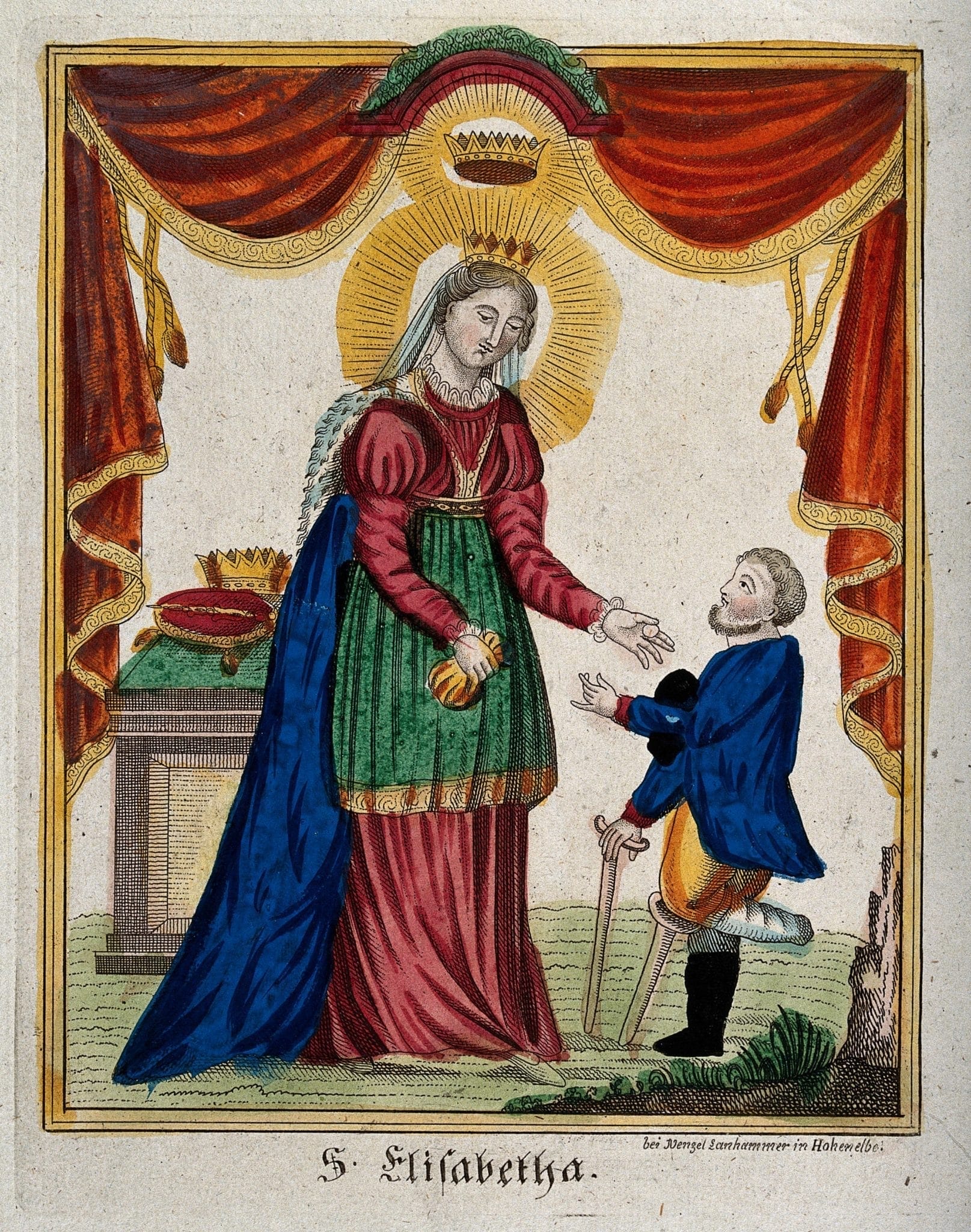 Saint Elizabeth of Hungary. Colored engraving by W. Langhammer.