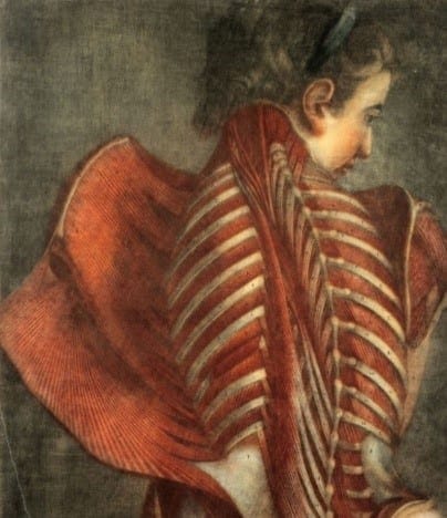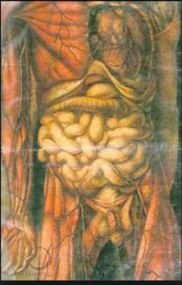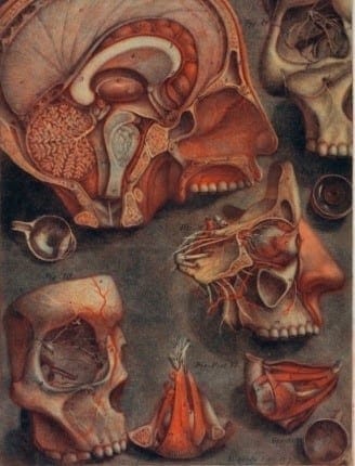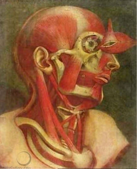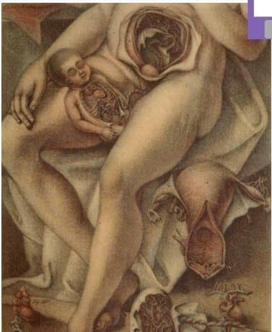 Moving to Paris in 1736, he had the idea of producing colored plates for use by students of anatomy, and associated himself with several surgeons and anatomists who were carrying out autopsies. His plates, more shocking than useful, showed partially dissected bodies that displayed deep structures, muscles, bones, and abdominal organs. He had some very realistic close-up views of female and male genitalia, sometimes damaged by venereal diseases, as well as an image of a woman’s head accompanied by an image of a pregnant woman with an open uterus and fetus.