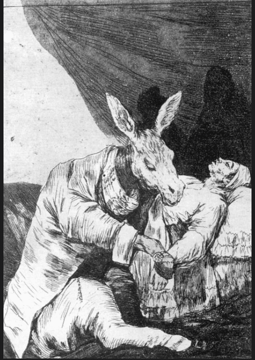 This is engraving number 40 from the Los Caprichos series by Francisco de Goya, published in 1799 and showing a donkey as a doctor attending a dying man in his bed. The doctor wears a watch to count the patient’s pulse but not a stethoscope because this had not yet been invented. It suggests that the doctor is uncaring or ignorant, not trying to help the patient but merely wondering about the nature of the disease. Could it be an interesting case, something worth writing about?