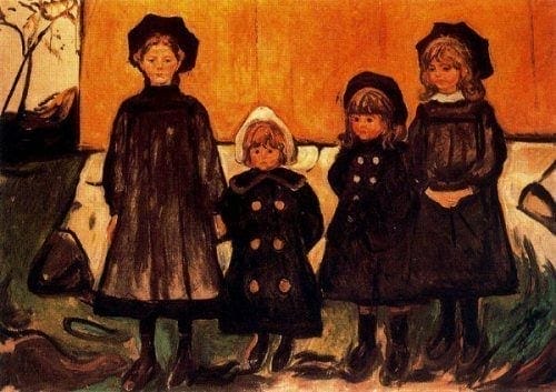 Children want to be happy. Munch tried to represent that by painting healthy and happy children. His friend commissioned him to paint his children in Dr. Max Linde’s Four Sons (Fig 3). He painted different stages of women’s lives in Family on the Road, the transition from childhood to adulthood in Puberty, and groups of children in Children Playing in the Street in Aasgaardstrand, Four Little Girls in Aasgaardstrand (Fig 4), Girls at the Beach, and Girls on the Pier.2
