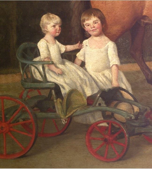 The youngest child of that generation, Mary Ann (1778–86), was born with short stature, was physically and mentally impaired, and suffered seizures with episodes of blindness.6 Despite treatment by Josiah’s friend, Dr. Erasmus Darwin (1731-1802), she deteriorated and died at the age of eight. In the family portrait, the artist Stubbs, with his eye for detail, has depicted her in a cart being partly supported by Sarah, suggesting that she could not walk or even sit upright without support. The unusual shape to her dress suggests that she is wearing incontinence padding. She has hands with short fingers (brachydactylia). Mary Ann had characteristic features of the MELAS (Mitochondrial myopathy, Encephalopathy, Lactic acidosis, Stroke-like episodes) syndrome, one of the first recognized mitochondrial disorders.7