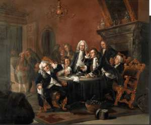 Six physicians are arguing around the table over the best way to treat their patient, who is barely visible in his bedroom, presumed to be suffering without treatment. Two other pairs of physicians are disputing in the background, and a monkey is seen in the right lower corner of the painting