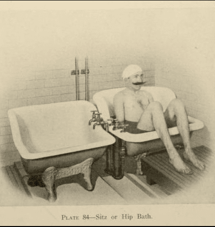 Water in the form of bathing and other techniques has been used since antiquity to relieve pain and promote healing. Also called water cure, it is now regarded as part of alternative medicine, often combined with massage, relaxation, and physiotherapy. It was particularly promoted in the early 1900s by Dr. Curran Pope, who claimed it would cure almost all ills, sometimes in conjunction with other practices such as electrotherapy or light therapy. To promote its use, he published Practical Hydrotherapy: A Manual for Students and Practitioners. Presented is an image from his book of a sitting tub designed to treat conditions affecting the hip or lower abdomen by soaking them. Other treatments found in Practical Hydrotherapy are hot air boxes, water caps for the head, compresses for any part of the body, baths, sprays, and showers.