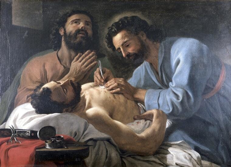 The renowned third century saints Cosmas and Damian were also doctors, often shown in paintings replacing a gangrenous leg with a healthy one. Here the two saints are performing an operation to remove a bullet from a patient’s chest.
