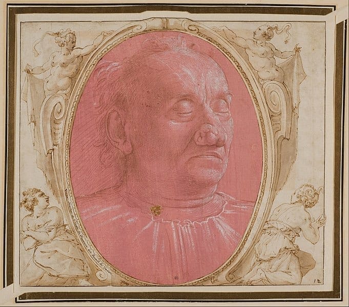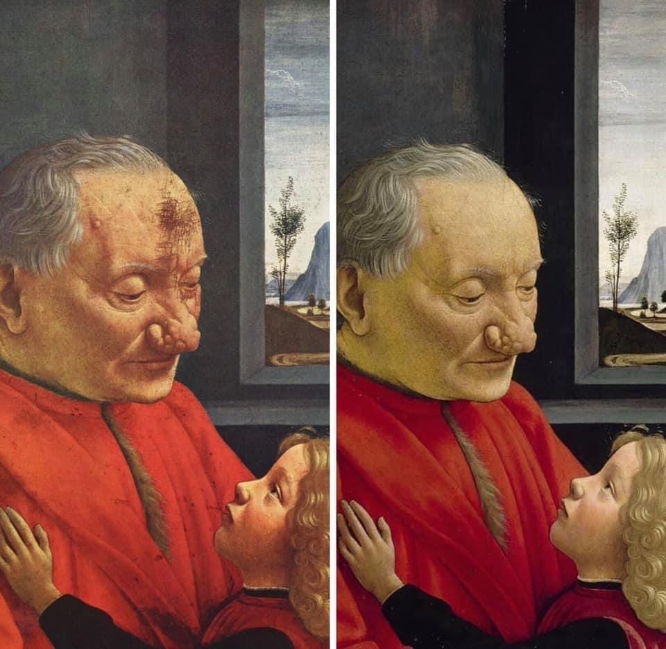 Whereas the Renaissance view of the old man was to focus upon his “old age-ness,” Ghirlandaio elevates the man’s wizened face and deformed nose to a tender moment where the elderly man and the child share a common bond—perhaps they are related, a grandfather and grandchild. In fact, the Italian name for this painting is very specific: Ritratto di un vecchio e nipote (Portrait of an old man and grandson (or nephew). The Italian word nipote can refer either to a grandchild or a nephew).