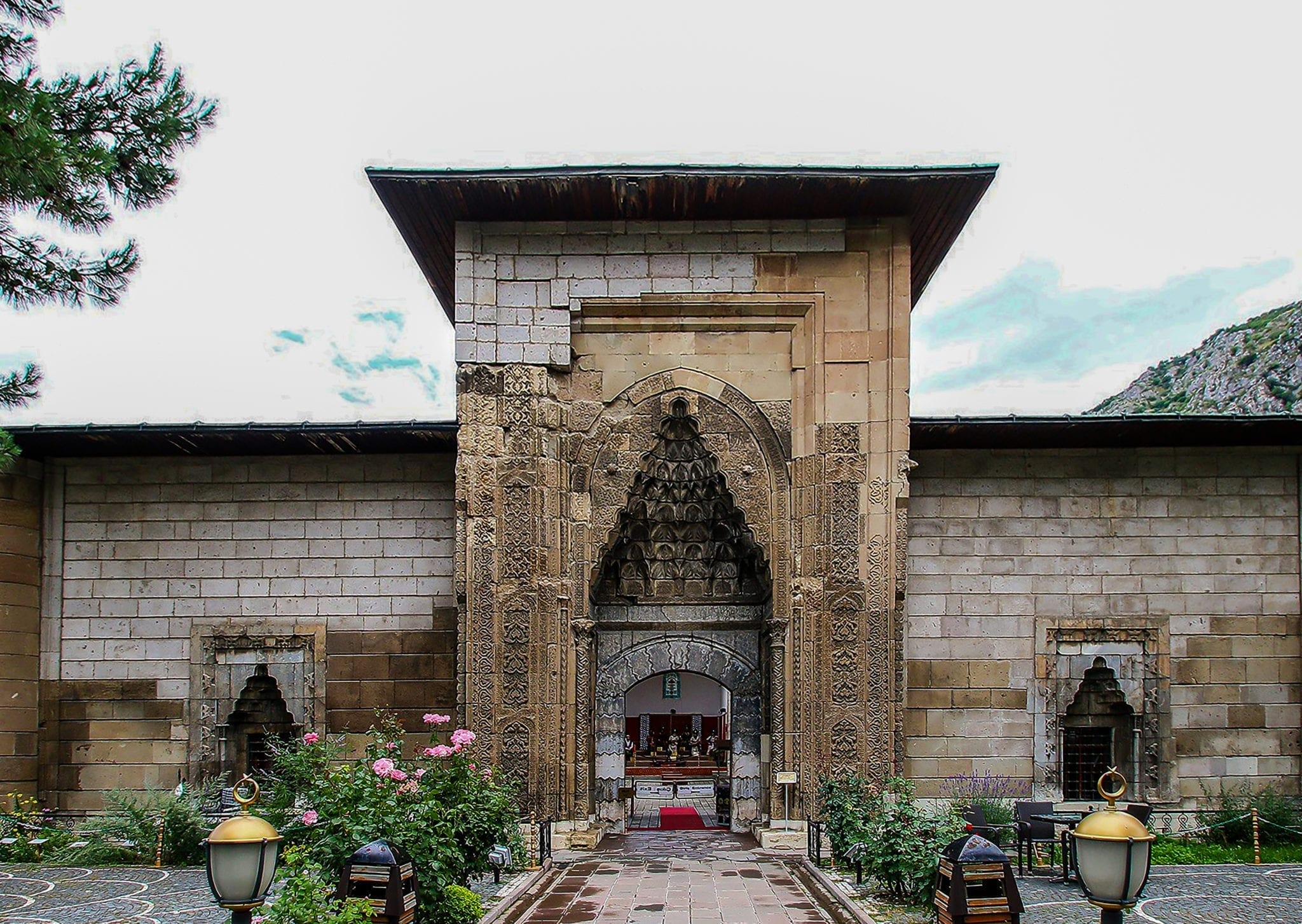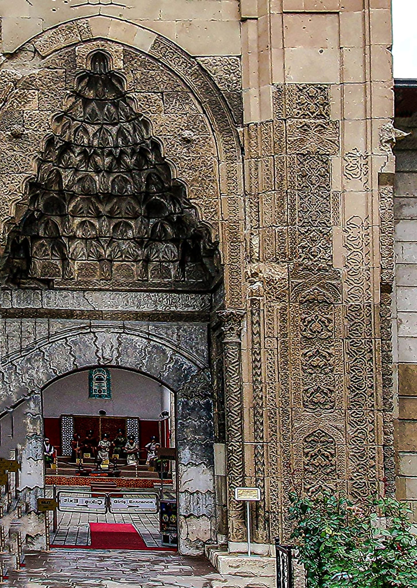 The building is a valuable example of Anatolian Seljuk architecture from the eleventh to the thirteenth centuries. The front of the building is considered very valuable in terms of art. The original columns bore geometric leaves and turbans and inverted triangle headings were used for the first time in Turkey. The rest of the columns are cylindrical and the corners of the building are made of cut stone. The building is entered through an ornate portal with an arched doorway inside a shallow iwan (three-sided rectangular space) with a ceiling consisting of a muqarnas (honeycomb vaulting) hood. The doorway is framed with bands of vegetal and geometric ornament carved in stone. Within the recessed entryway are two smaller muqarnas niches surmounted by inscription bands.