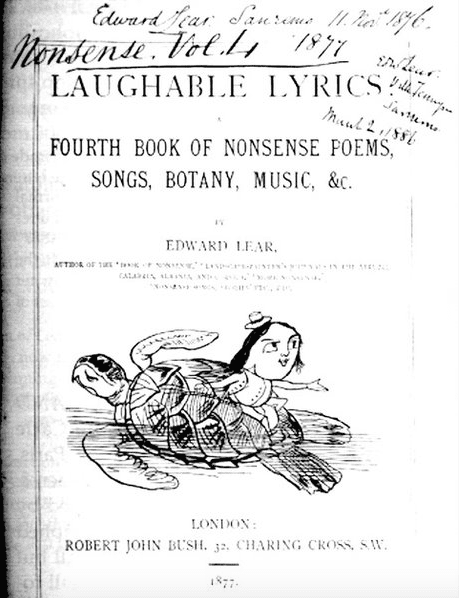 He published three volumes of bird and animal drawings, seven illustrated travel books (notably Journals of a Landscape Painter in Albania, &c., 1851), and four books of nonsense rhymes, stories, and songs. In 1877 his Laughable Lyrics (Fig 3) contained some of his finest but also his most melancholy songs, including The Pelican Chorus, The Yonghy-bonghy-bò, and The Dong with a Luminous Nose.