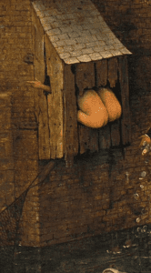 The figure of “de kakker,” (“the crapper”) appears in several of Bruegel’s works.4 In Superbia, (c.1556), part of his series Seven Capital Sins, one sees a behind, from which excrement issues. The same applies to Luxuria (1557). In The Fair at Hoboken (1559), there are at least two men openly defecating. The depiction of defecation is much more discreet in The Tower of Babel (1563), where de kakker is a tiny figure in the foreground. In The Peasant Dance (c. 1567-1568), we see the back of a man who is facing a wall, maybe discreetly urinating.6