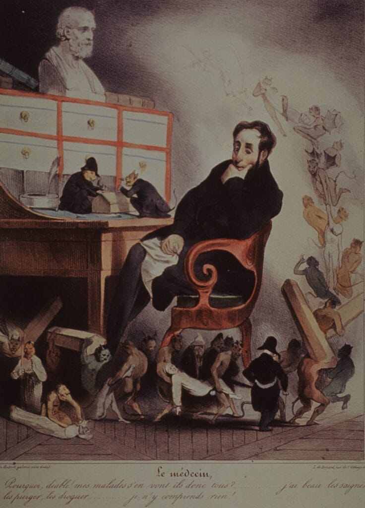 He earned his living by producing caricatures and cartoons for illustrated magazines. He was charged on two occasions with “contempt for the king’s person” because of some cartoons and spent time in prison along with his editor. He created over 100 drawings about doctors, calling them “profiteers, mouthers of clichés, montebanks.” In his drawings they are pedantic, vain, avid, egotistic, or hard and indifferent. Their methods of treatment included dieting, leeches, and “an absurd arsenal of remedies.” Mondor hoped that upon seeing these caricatures, doctors would correct “certain failings.”