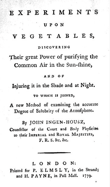 - Ingenhousz J. Experiments upon Vegetables—Discovering Their Great Power of Purifying the Common Air in the Sunshine and of Injuring It in the Shade and at Night. London: P. Elmsly and H. Payne, 1779.