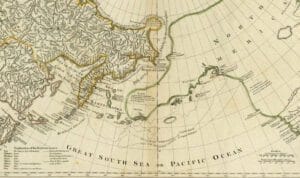 Crop of “The Russian Discoveries” map by Thomas Jefferys showing the paths of the Kamchatka Expeditions (click to view). From The American Atlas: or, a Geographical Description of the Whole Continent of America. London: R. Sayer and J. Bennett, Map and Print Sellers, 1776. Via Wikimedia. Public domain.