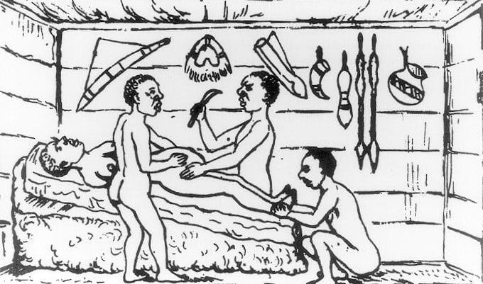 Robert Felkin (1853–1926) was in 1879 a Scottish medical student on a missionary expedition to Africa. There, he had the opportunity to observe a cesarean section done by a local healer in Uganda. The patient was a woman of about twenty and it was her first pregnancy. After a period of unsuccessful labor, her healer decided to resort to a cesarean section. The naked patient was fastened to a board by cloth strips around her chest and thighs. An assistant held her ankles. She was semi-conscious from the banana wine she was given to drink. The operator washed his hands and the patient’s abdomen with wine and made a midline vertical incision that began “just below the umbilicus.” This incision cut through the abdominal wall and partway through the uterine wall. Bleeding vessels in the abdominal incision’s edges were cauterized with a red-hot iron. The incision in the uterine wall was deepened, an assistant separated the incision’s edges, the infant was taken out, and the cord was cut. No sutures were placed in the uterus. The abdominal incision was closed with seven thin iron pins and fastened with string. A paste made of two different roots was applied to the wound, and a dressing was placed.4 Some pins were removed on the third post-operative day, and the rest by the sixth day. There were no signs of any systemic infection.5 By the eleventh day, the wound was healed completely.6