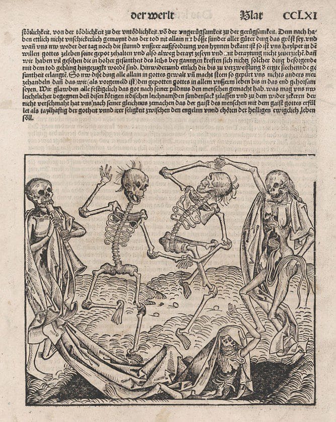 Memento mori strongly influenced religious art and medical education in the Middle Ages.2 Depictions of death and decay, found within murals, paintings, and even plays, were constant reminders of life’s transience.2 A popular theme was the Danse Macabre or the “Dance of Death,” which depicted a skeletal figure leading people of all backgrounds—popes, kings, emperors, laborers, and children—to their final resting place, illustrating the universality of this ultimate human experience.3 Dance of Death by Michael Wolgemut (1493) is a woodcut that exemplifies this concept: five skeletons engage in an almost celebratory dance over their own grave.3