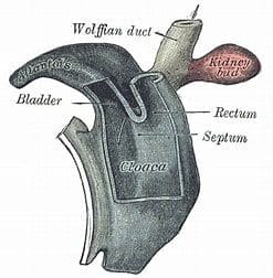 The majority of mammals have evolved away from having a cloaca at birth; however, all mammalian fetuses go through a stage of development when they have a cloaca that divides into an anterior genitourinary system and a posterior hind gut.12,13 The human fetus develops a cloaca by the fifth week of development, and normally by the seventh week, it divides into an anterior urogenital and posterior anorectal section because of differential growth between its ventral and craniodorsal parts.14 Sometimes, for unknown reasons, the cloaca does not divide and the baby is born with a “persistent” cloaca. This anomaly is believed to occur in approximately 1:20,000-50,000 births. It typically occurs in females, though a handful of boys have also been reported to have a cloaca. In humans a persistent cloaca must be corrected surgically as stasis of urine in the urinary bladder greatly increases the risk of urinary tract infections upon contamination with stool. Apart from complicated surgical corrections, the management of these children has to consider that they also have one or more associated anomalies that may affect the spine, kidneys, heart, esophagus, and limbs. With a lifetime of proper care, these patients can lead a full and productive life.