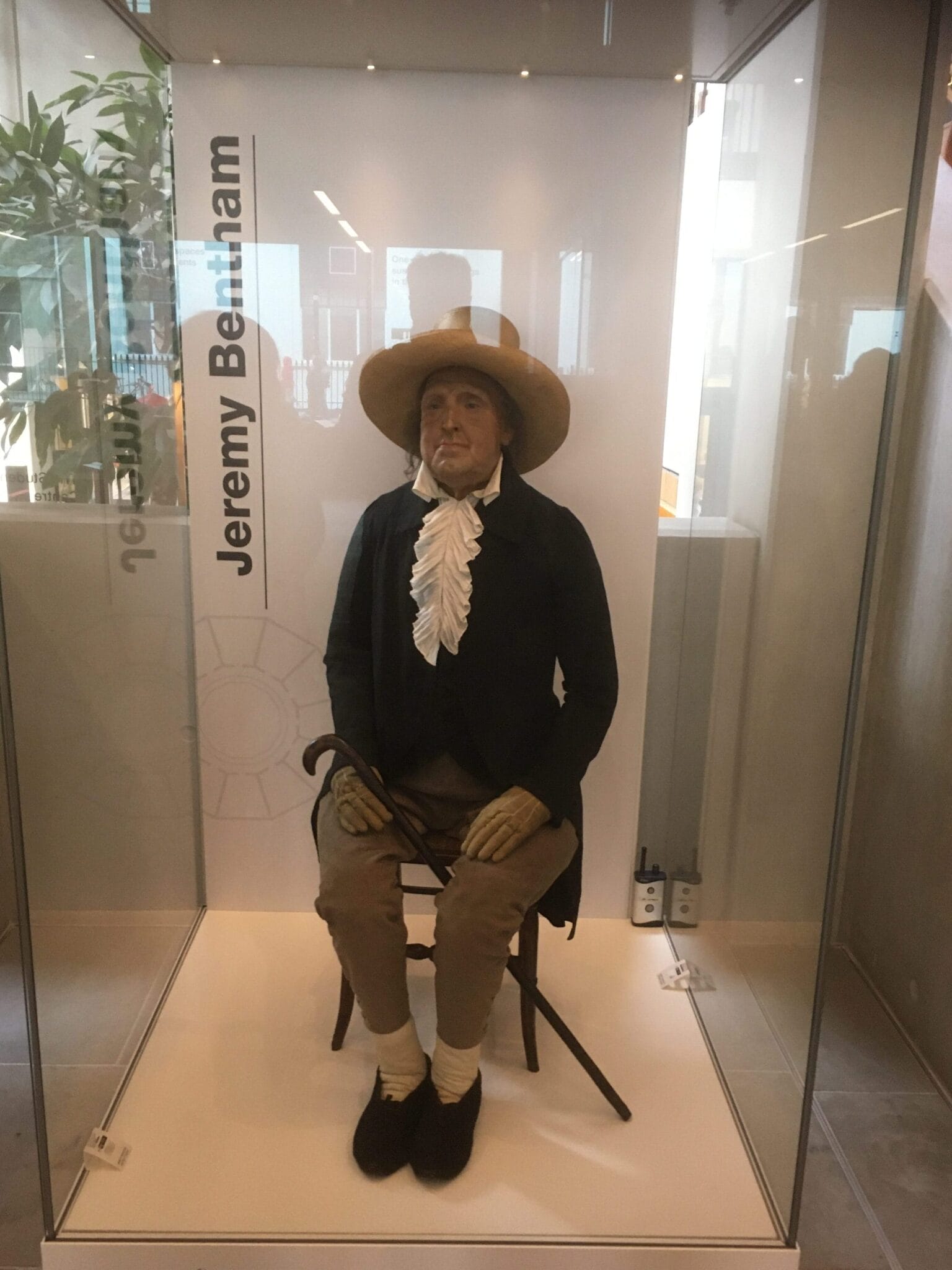 According to his wishes, Bentham’s cadaver was reduced to a skeleton, the skeleton was placed in one of his suits, and the suit filled out with hay and straw. The preparation of the skeleton, unfortunately, deformed Bentham’s head, and Smith had a sculptor create an excellent likeness in wax. This skeleton-in-a-stuffed-suit was placed on Bentham’s favorite chair. Lavender and naphthalene were added to the stuffing to protect against insects. This auto-icon, as Bentham called a cadaver so treated, stayed in Dr. Smith’s office until 1850, at which time Smith donated it to the Anatomical Museum of the University College of London. It was moved to the English countryside during World War Two to protect it from German bombs. It is now back at the University College in its glass and mahogany case at the entrance to the student center.6,7,8