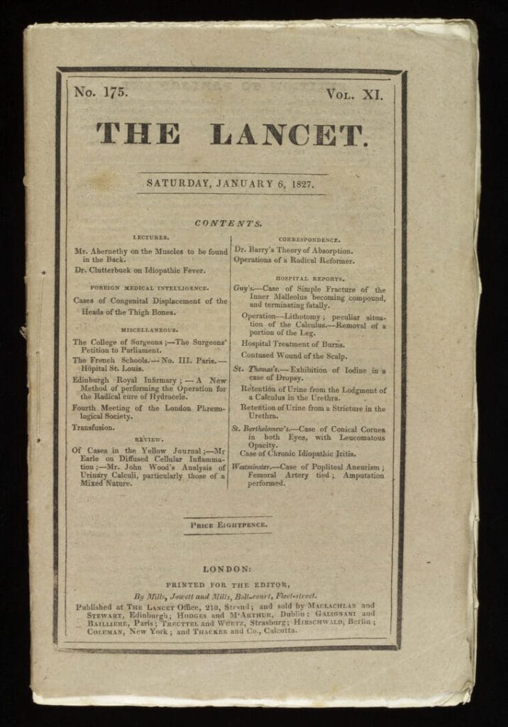 Thomas Wakley was the youngest of eleven children of a Devonshire farmer. He had studied medicine at Guy’s–Thomas’ for five years and in 1820 had opened a practice in central London, which however was largely ruined by the above-described events. In 1823, under the influence of a radical politician, he started an educational medical journal called The Lancet.1,2 He entered Parliament in 1835, and for some time also worked as a medical examiner (coroner) but spent most of his life as editor of his journal.