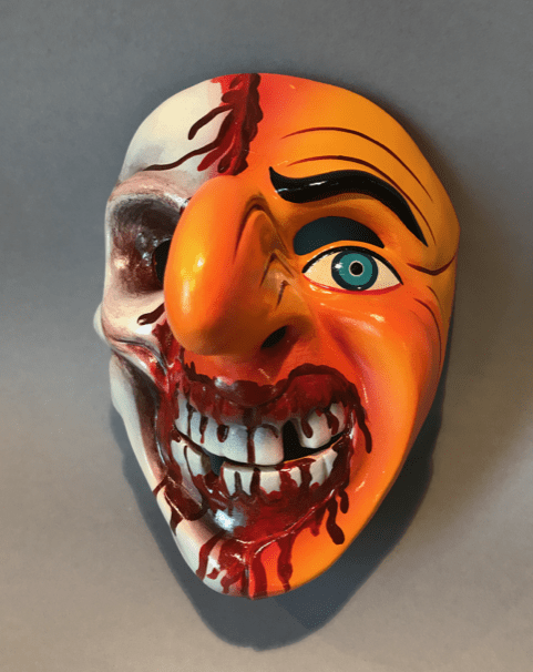 Masks like this one are worn in the festival of the Virgen del Carmen (Our Lady of Mount Carmel), celebrated between the 15th and 19th of July in the Peruvian town of Paucartambo, found almost 50 km NE of Cusco. During this festival, the Virgin is mainly honored through performances of different dance groups. One of these groups is formed by chukchu dancers. These dancers wear yellow masks, such as those depicted, to represent agricultural workers who have contracted malaria in the jungle and come to Paucartambo to be blessed and cured by Mamacha Carmen. A chukchu group does not only portray patients, but also includes other characters, such as a doctor, nurses, and mosquitos. The dancers pretend to infect the spectators by attacking them with yellow bags. Today, chukchu masks do not always depict malaria, but may also portray signs of other diseases, such as leishmaniasis, yellow fever, AIDS, cancer, or through general skull-like features.