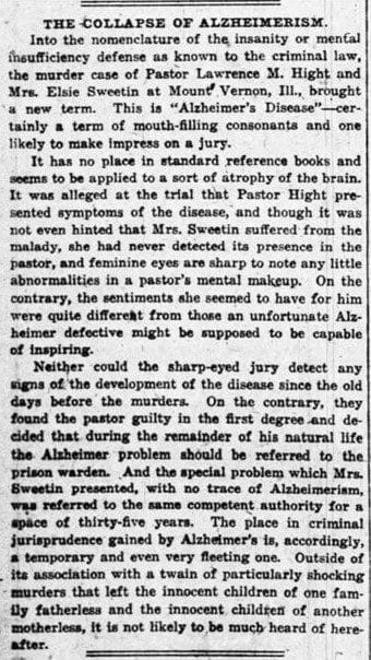 - The best publicity that Layman received was from a Los Angeles Times header that claimed, “Very Few Physicians” knew about AD but “even a layman would easily recognize it.” Los Angeles Times, “Novel Insanity Plea for Hight: Attorneys Aver Preacher Has Alzheimer’s Disease Very Few Physicians Know of Such Malady,” December 14, 1924.