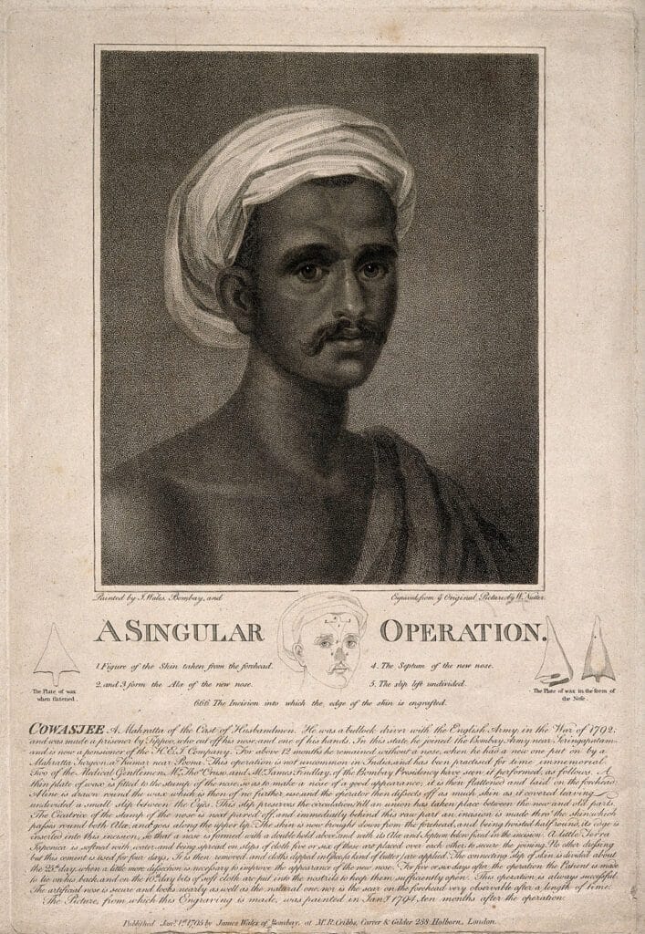It appears likely that Sushruta’s methods eventually traveled to medieval Europe, where they may have been copied by a number of Italian surgeons.1 However, European interest in plastic surgery eventually faded away.1 This all changed when plastic surgery came back to the attention of Western medicine in 1794. In the October issue of The Gentlemen’s Magazine and Historical Chronicle of London, a British surgeon described a procedure that he had witnessed in India for reconstructing the amputated nose of a bullock driver named Cowasjee.3 The technique—using a flap of skin from the face to reconstruct the nose—was almost identical to Sushruta’s description, with one key difference: instead of using a skin flap from one of the patient’s cheeks, the flap was taken from the forehead.3 “This operation is now common in India,” the author wrote, “and has been practiced from time immemorial.”2