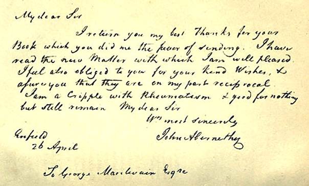 Mr Abernethy was one of those pupils of John Hunter who appears the most completely to have caught the bold and philosophical spirit of his great master … As a lecturer, he was not less distinguished than as an author. He enjoyed more than an ordinary share of public favor in the practice of his profession; and, though not a little remarkable for the eccentricities of his manner and an affected roughness in his intercourse with his ordinary patients, he was generally kind and courteous in those cases which required the full exercise of his skill and knowledge, and also liberal in the extreme when the infliction of poverty was superadded to those of disease.