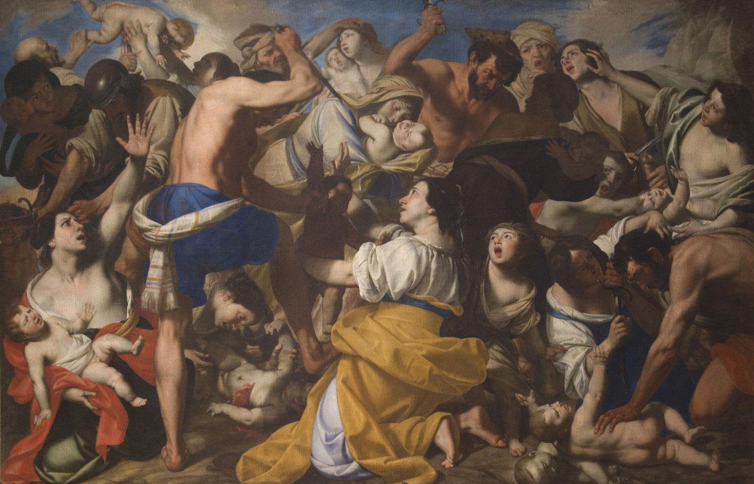 We approach a large canvas about six feet tall and ten feet wide. At the top of the painting, a grey blue sky holds a few brown colored clouds. The rest of the canvas is crowded with the savagery of slaughter, powerful soldiers killing and mothers shielding, fighting, or mourning the slaying of their infants.