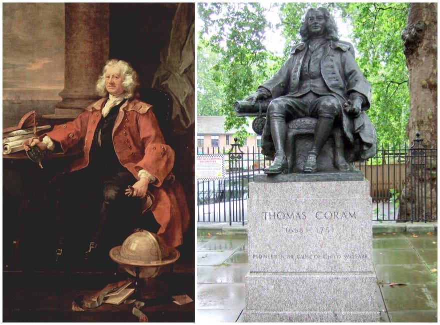 Right: Thomas Coram statue. 40 Brunswick Square, London. Photo by ceridwen on Geograph.org.uk via Wikimedia. CC BY-SA 2.0.
