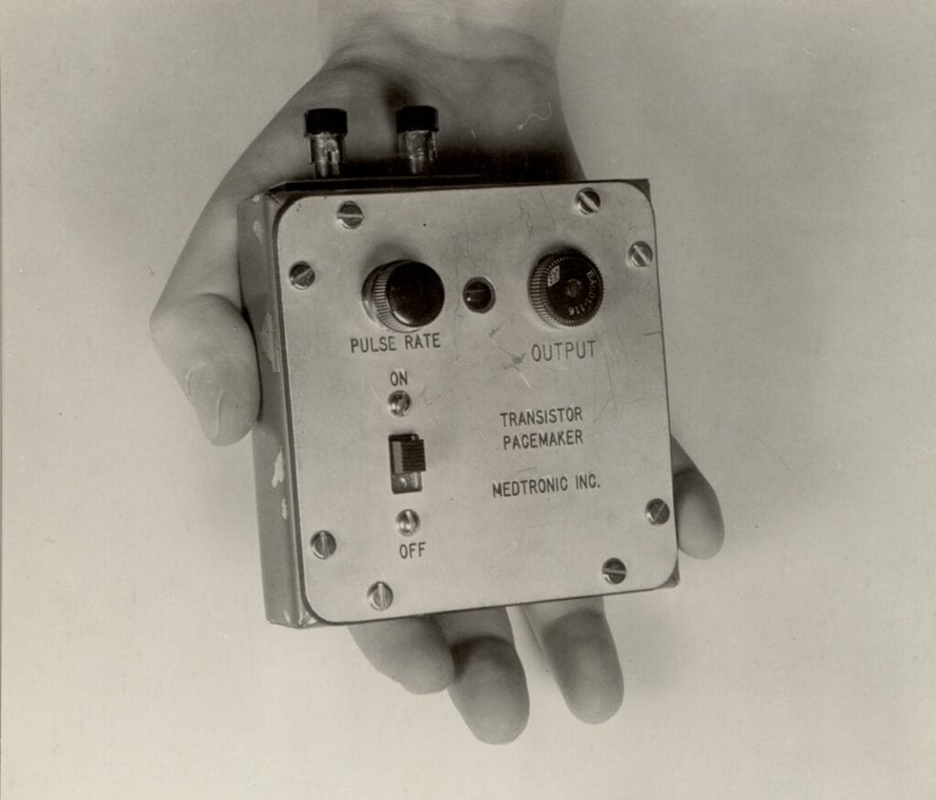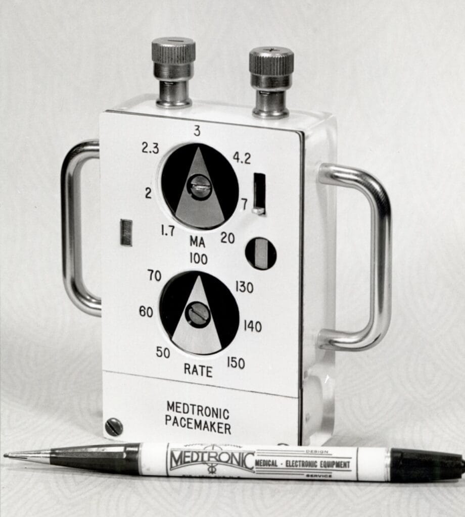 Bakken developed the external-battery pacemaker after cardiac surgeon Clarence Walton Lillehei lost a patient during a 1957 power blackout in the Twin Cities.1 Dr. Lillehei was a pioneer in repairing congenital heart defects in children. At that time, complete heart block developed in 10–20% of patients undergoing the procedure, usually from injury to the heart’s conduction system during the surgery itself.2 This complication was essentially eliminated when Lillehei began using a myocardial electrode with an external, plug-in electric stimulator. However, these systems were large and depended on the integrity of an external power supply and cord. Lillehei approached Bakken and asked him to develop a more reliable pacemaker.
