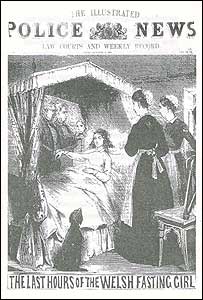 In 1869, a twelve-year-old Welsh girl named Sarah Jacob became famous for claiming she had eaten nothing for two years. Crowds came to visit her at her family farm, and many made donations. She lay in a decorated bed wearing a crown of flowers, serene and apparently healthy—the “Welsh Fasting Girl.”