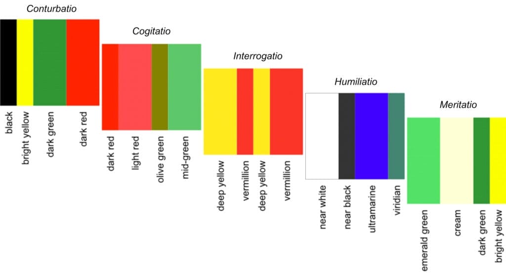 Marden used Caracciolo’s designations—Conturbatio, Cogitatio, Interrogatio, Humiliatio, and Meritatio—as the titles for the five artworks in his series. As noted earlier, each consists of four vertical, colored strips with different combinations of widths in the different paintings. The colors are not simple flat blocks, but consist of many layers of oil paint mixed with beeswax and turpentine, giving the surface a rich, shimmering appearance. While it is possible to list names for the colors in the panels (Figure 1), a small-scale printed or digitized reproduction cannot convey anything of the experience of seeing Marden’s paintings. As critic Michael Zakian has observed, “Our language is not complex enough to accurately describe a Marden color. It must be seen. Even color reproductions are not sufficient to fully appreciate a Marden painting, for the oil and wax paint creates a beautifully impenetrable dense surface that has to be experienced first‑hand.”14